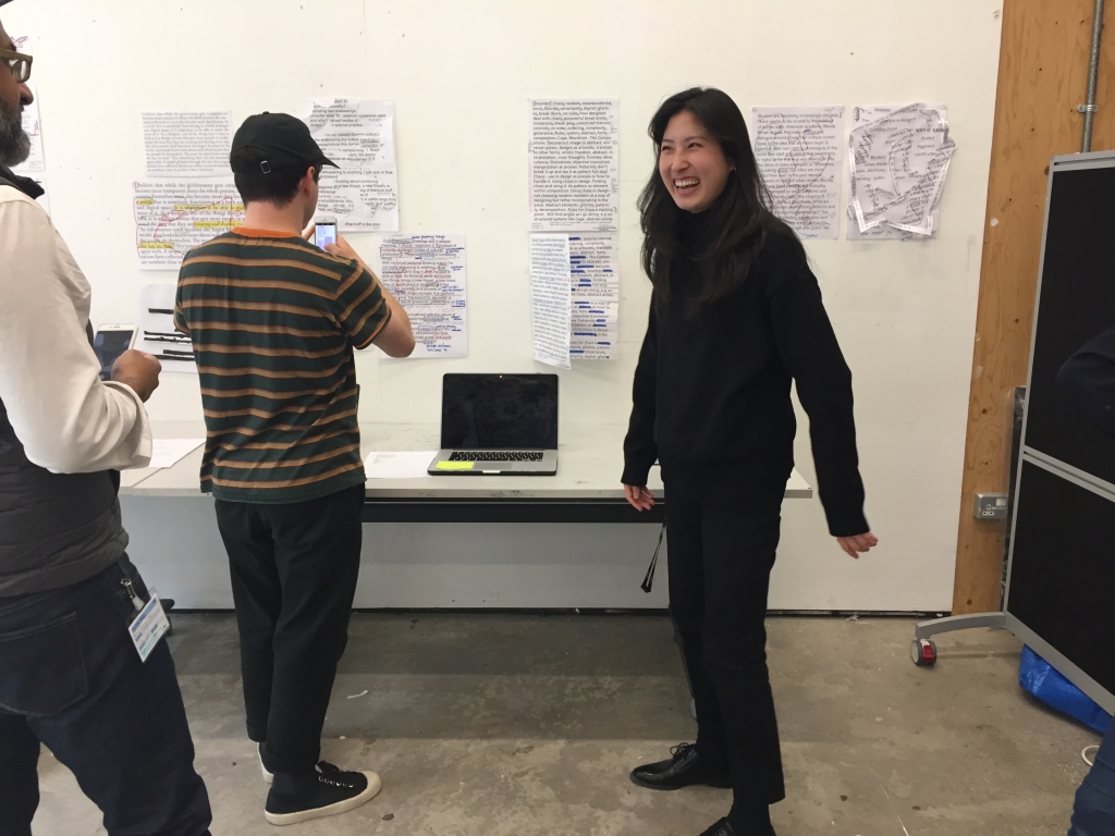 Workshop with Emily Smith and Prem Krishnamurphy, in which we worked on each other’s 150 word excerpts (from written draft of research paper), before reconstructing our writing and making a related piece within limited timeframes.