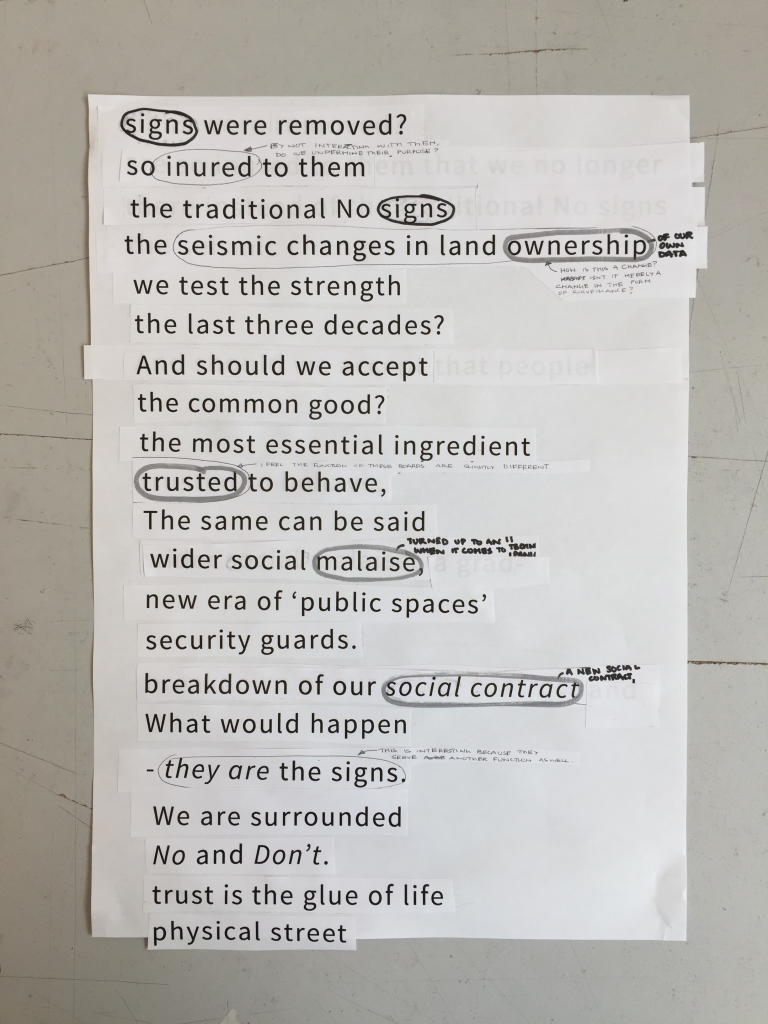 As I reconstructed the writing I found I was reducing random lines down into soundbite-like short sentences, almost replacement messages for the signs I’d been recording. Could I use this as a form for my writing?