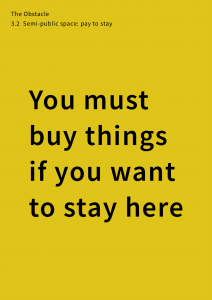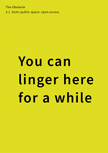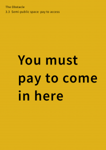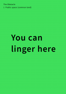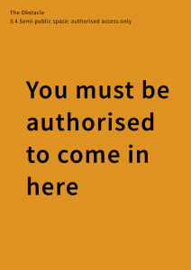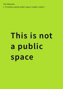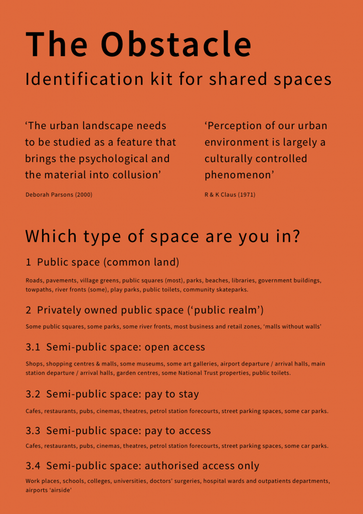 I’ve recently been experimenting not just with categorising obstructions by the material they are made of, but also the types of ‘public’ space they are found in. With this in mind, for our recent one-day Make It Public! workshop I produced a quick identification kit of posters for shared spaces named The Obstacle.